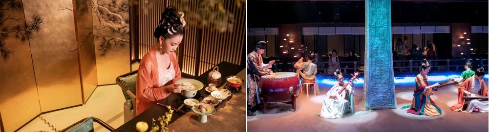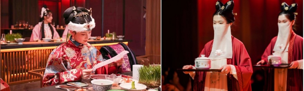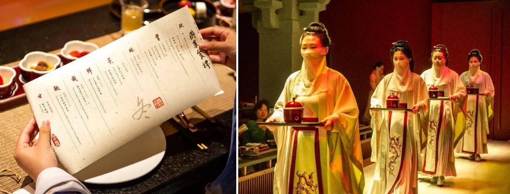 沉浸式主題演出 整場晚宴約90分鐘,演出貫穿始終。 您將欣賞到一系列精心編排的節目,內容可能包括祭禮、迎禮、樂禮、舞禮、茶禮、曲禮、慶禮等環節。節目會根據不同季節或主題變換,例如您可能會遇到以唐朝為主題的演出,欣賞到如《長恨歌》、《牡丹亭・遊園驚夢》、《霓裳羽衣》等經典曲目的演繹 。